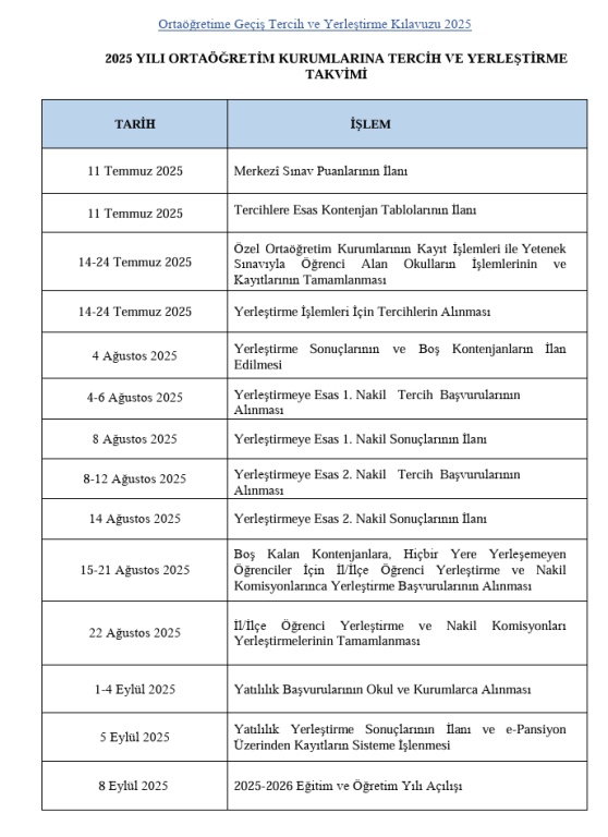2024-2025 eğitim ve öğretim yılında ortaokul veya imam hatip ortaokulu 8’inci sınıfını başarıyla tamamlamış ya da Açık Öğretim Ortaokulundan mezun durumda olan öğrenciler, sınavla öğrenci alan okulların belirlenen kontenjanlarına puan üstünlüğü ve tercihleri doğrultusunda; yerel yerleştirme ile öğrenci alan okullara ise okulların türü, kontenjanı ve konumuna göre il/ilçe millî eğitim müdürlüklerince oluşturulan ortaöğretim kayıt alanlarındaki okullara öğrencilerin ikamet adresleri, okul başarı puanları ve devam-devamsızlık kriterleri göz önünde bulundurularak yerleştirilecektir. Yerleştirme yapılacak okullar https://www.meb.gov.tr veya https://eokul.meb.gov.tr internet adresinden yayımlanacaktır. Yerleştirme sonuçları 4 Ağustos 2025 tarihinde ilan edilecektir.